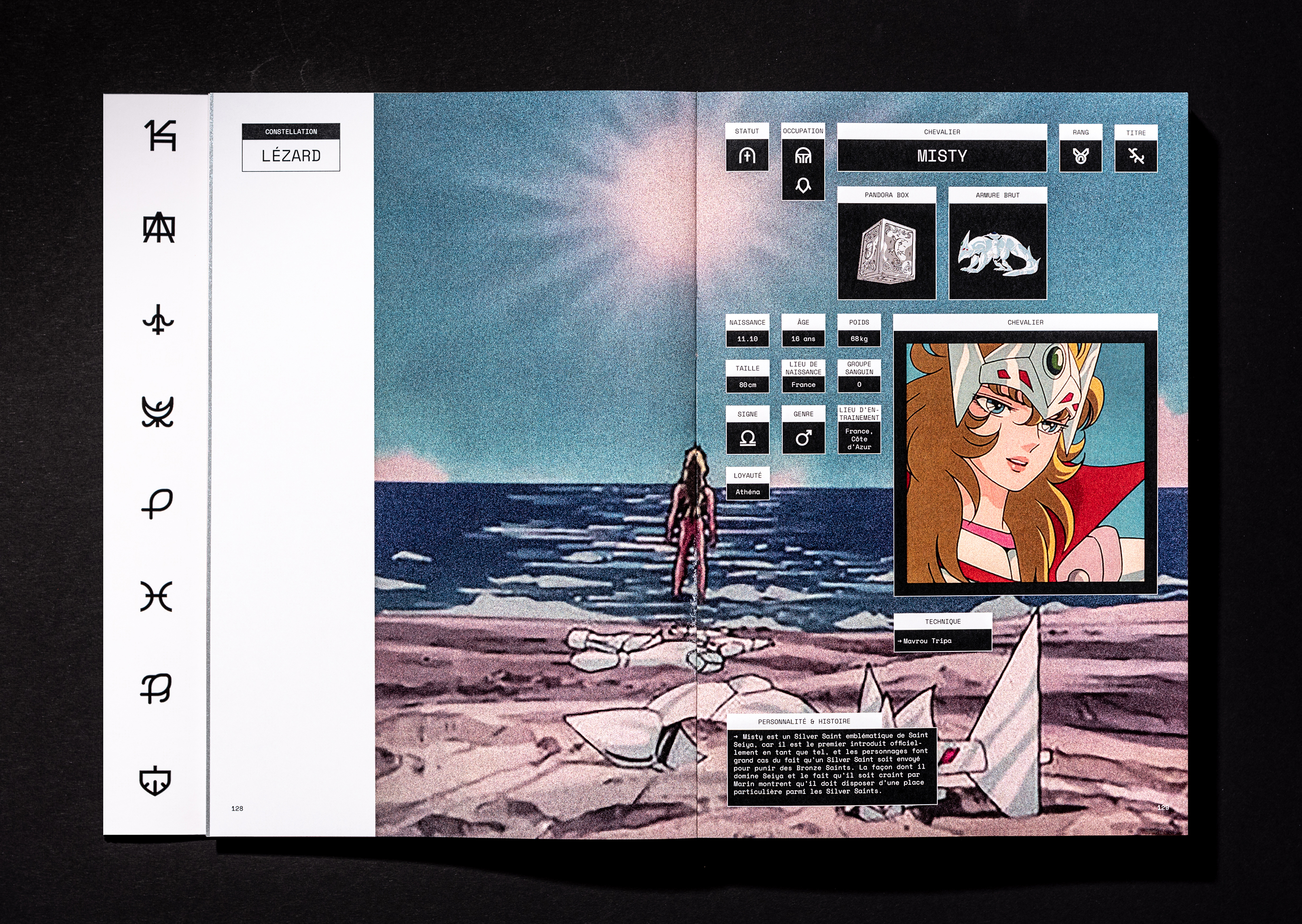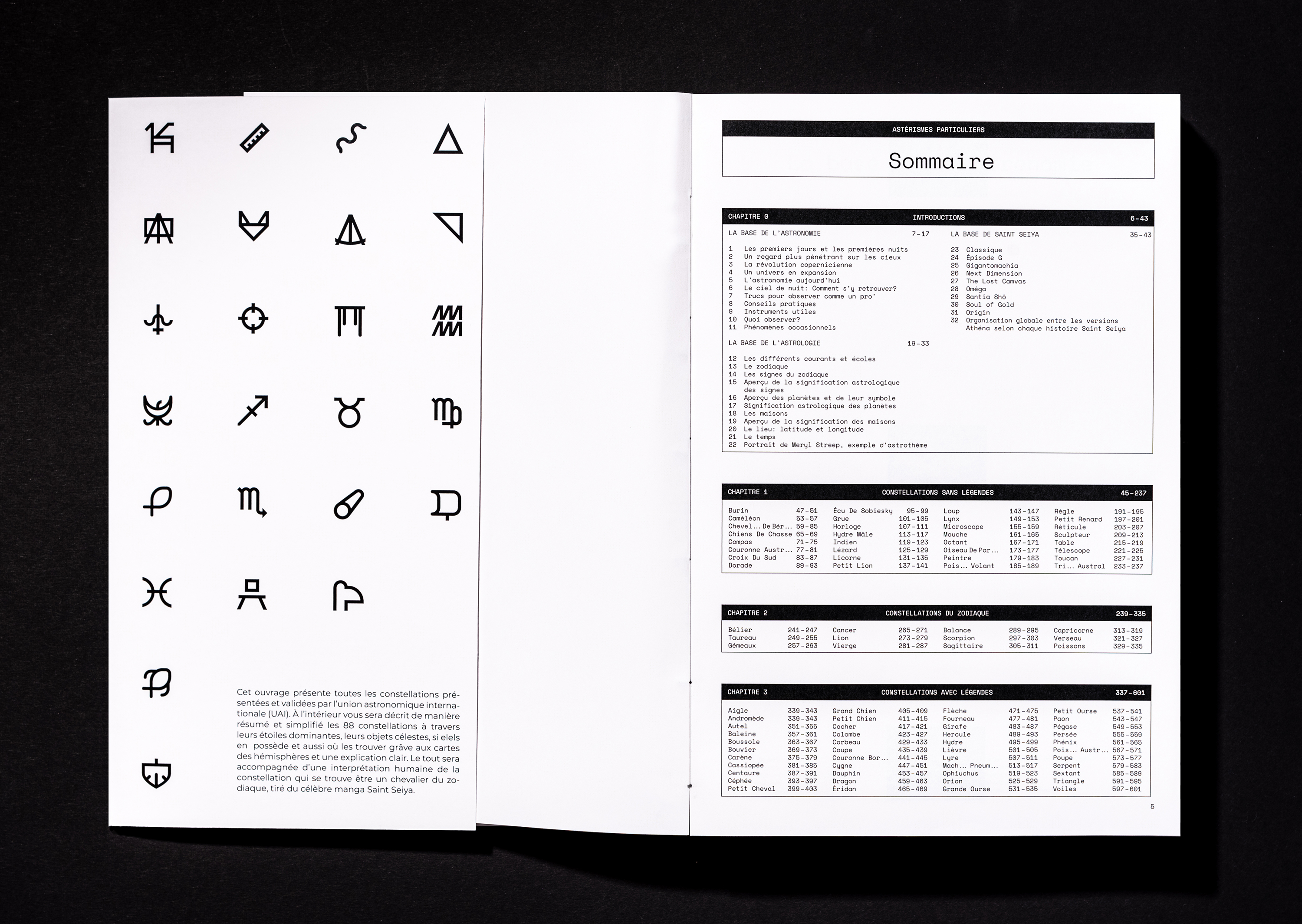 Astérismes particuliers est une édition qui regroupe les 88 constellations connues et validées par l’union astronomique internationale. Son but? Faire découvrir le monde de l’astronomie et de l’astrologie avec un résumé global de chaque constellation imagée par les célèbres chevaliers du zodiaque du manga Saint Seiya! Elle se divise en plusieurs chapitres; introduction à l’astronomie, l'astrologie et Saint Seiya, les constellations créées récemment donc ne possédant pas de mythes, les classiques constellations du zodiaque et les constellations avec légendes.