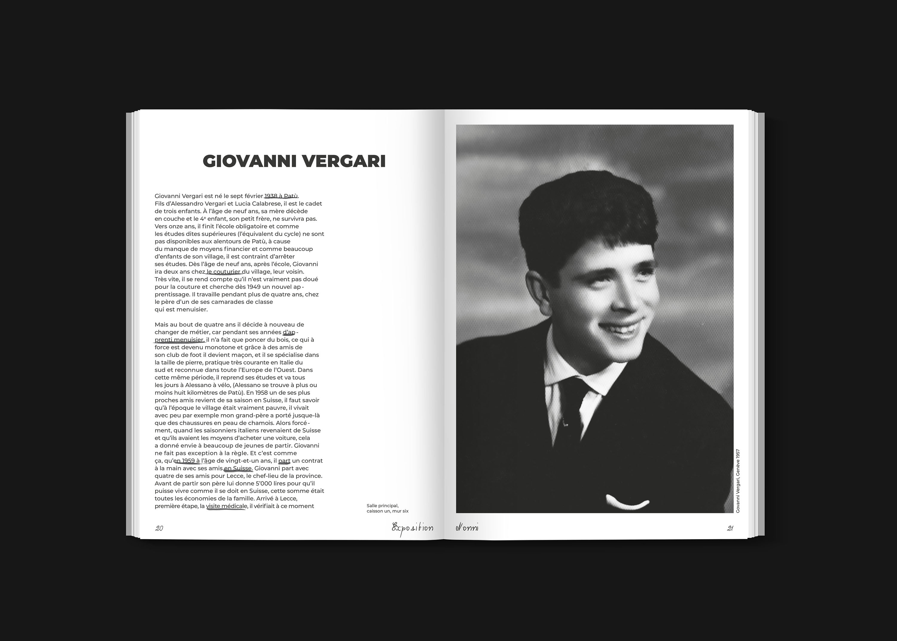 L’exposition Nonni (grands-parents en italien), nous plonge dans les coulisses de la grande vague d’immigration italienne qu’a connue la Suisse au milieu du vingtième siècle. A travers des anecdotes, récits et autres archives, l’exposition retrace le parcours de mes grands-parents et met en lumière une partie souvent méconnue de l’histoire suisse. Cette exposition rend également hommage à mes grands-parents et indirectement aux immigrés italiens en Suisse.