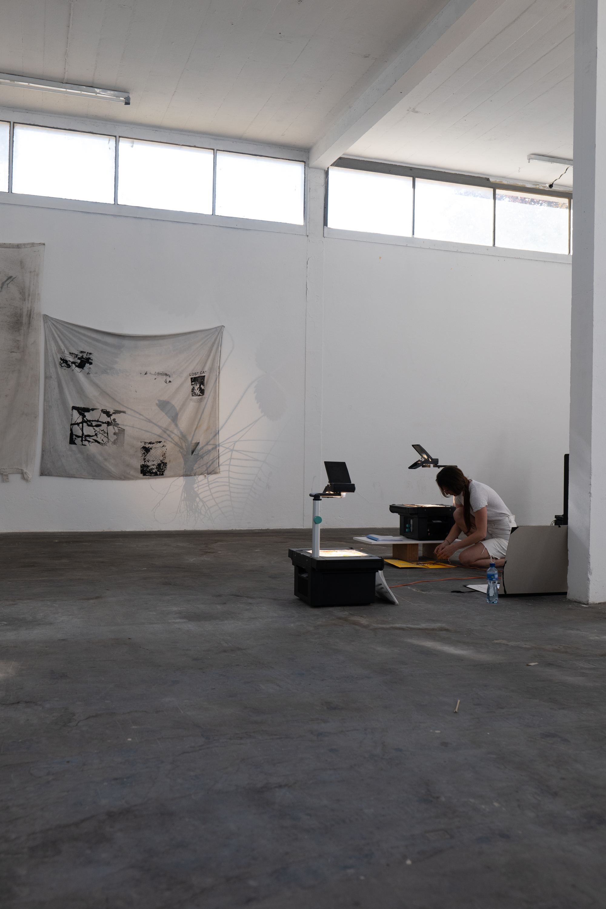 She’s zoning (temporary territoriality) est un dispositif tridimensionnel délimitant les contours d’un territoire au moyen du langage. Il orchestre la juxtaposition et la superposition de surfaces, de fragments, de plis et de récits dans un jeu d’ombres et de lumières. Une sélection de mots et de motifs choisis se déploie dans l’espace et le temps, formant et (re)formulant sans cesse les itinéraires empruntés, questionnant les mots, leur(s) usage(s), leurs définitions et interrelations. L’installation s’accompagne d’une lecture et d’une version non éditée de mon mémoire. Au cours de l’exposition, j’apparais quotidiennement selon un horaire aléatoire, manipule le dispositif de projection et zone dans les parages.