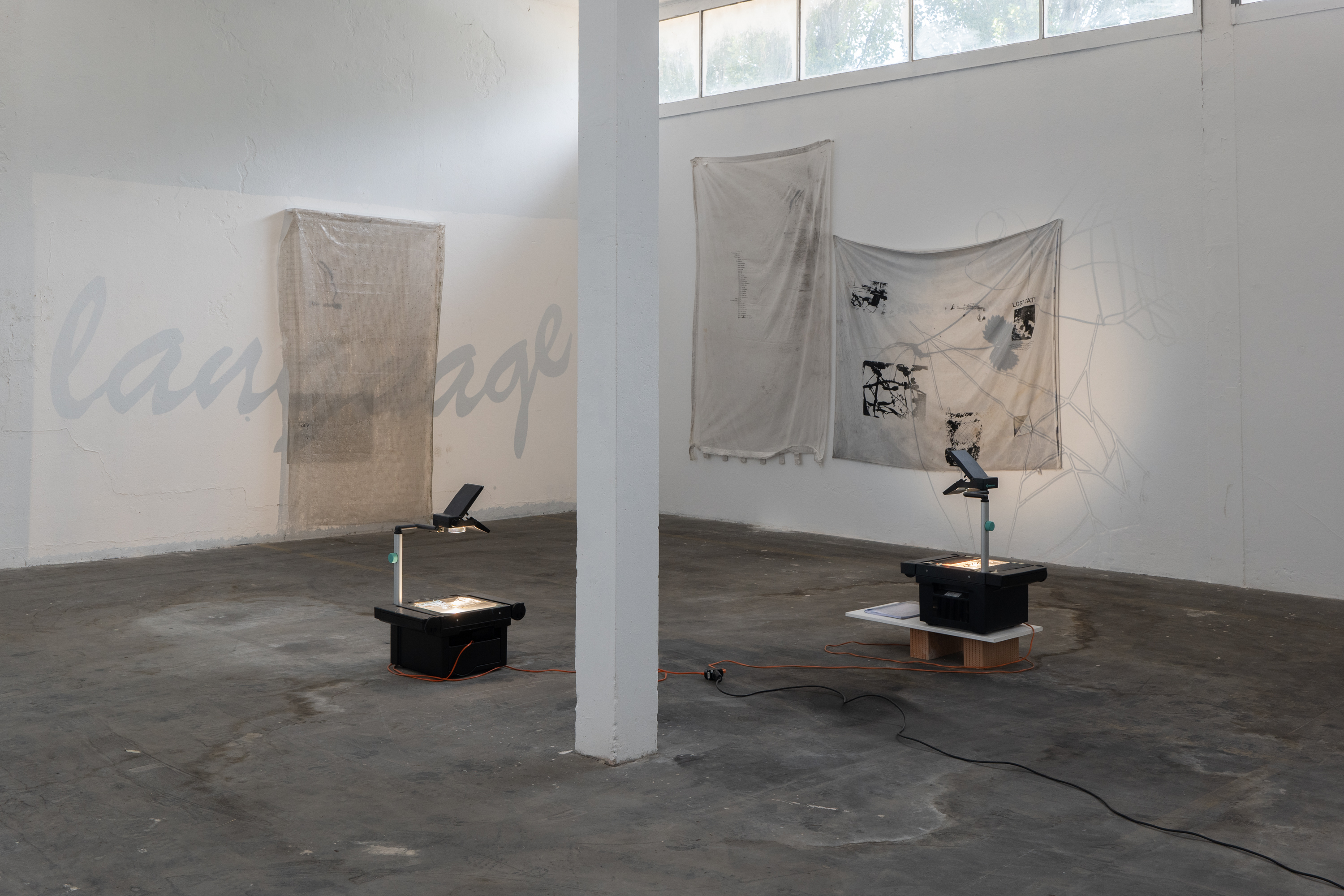 2021, installation (6 x 6 m) et lecture (15'), draps, rideaux, bâche, sérigraphies, rétroprojecteurs, découpages, plexiglas, films plastiques transparents, moisissure, toiles d’araignée, classeur