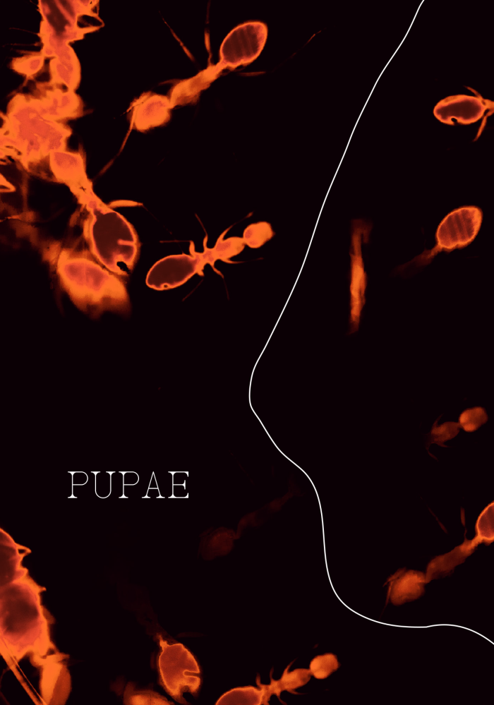 Pupa, le titre du projet, est la traduction latine de 'pupe', qui désigne en français une nymphe, soit le stade intermédiaire entre la larve et l'insecte dans sa forme définitive. Il s'agit ainsi d'un être en développement, prêt à devenir l'un des membres de cette immense communauté.